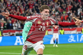 Zsombor Gruber of Hungary celebrates scoring during a World Cup qualifying group F soccer match between Hungary and Armenia in Puskas Arena in Budapest, Hungary, Saturday, Oct. 11, 2025. (Tibor Illyes//MTI via AP)