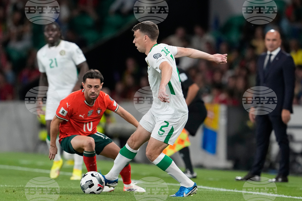 Jake O'Brien of Ireland, left, and Bernardo Silva of Portugal battle for the ball during a World Cup 2026 group F qualifying soccer match between Portugal and Ireland in Lisbon, Saturday, Oct. 11, 2025. (AP Photo/Armando Franca)