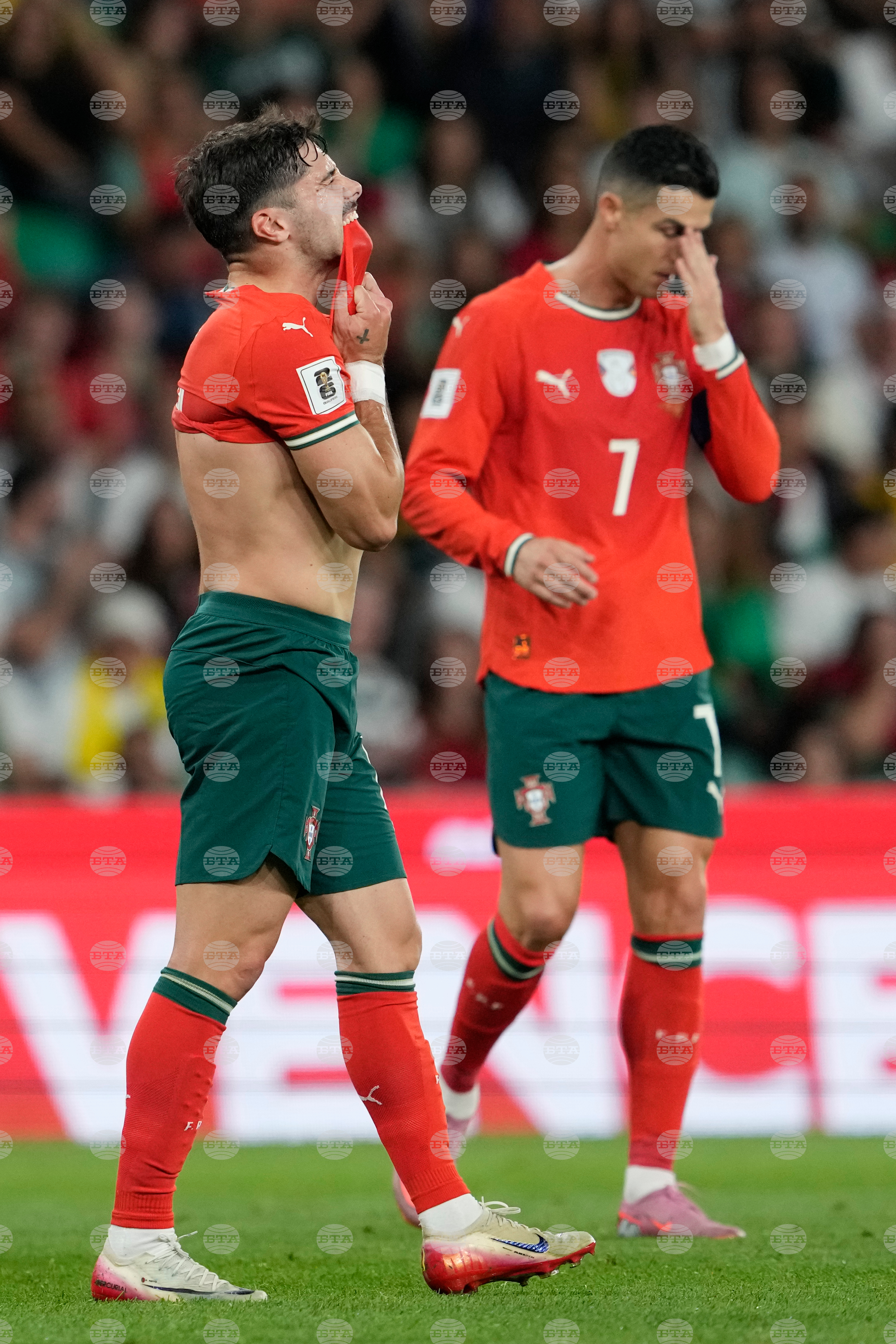 Pedro Neto of Portugal, left, reacts after missing a chance to score a goal during a World Cup 2026 group F qualifying soccer match between Portugal and Ireland in Lisbon, Saturday, Oct. 11, 2025. (AP Photo/Armando Franca)