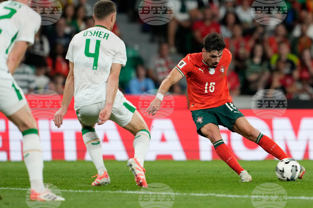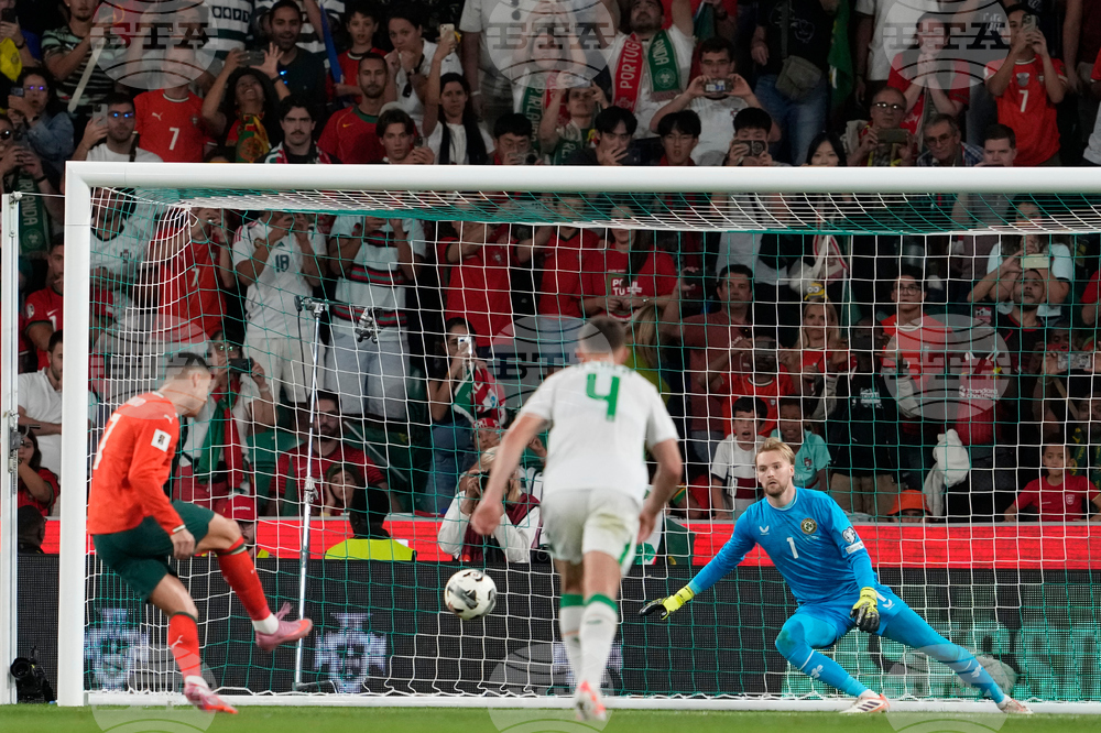 Ruben Neves of Portugal, right, scores his side's opening goal against Ireland during a World Cup 2026 group F qualifying soccer match between Portugal and Ireland in Lisbon, Saturday, Oct. 11, 2025. (AP Photo/Armando Franca)