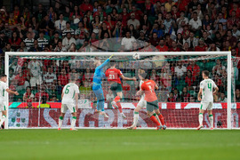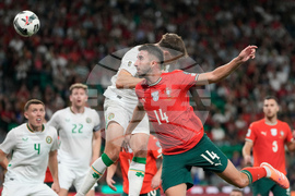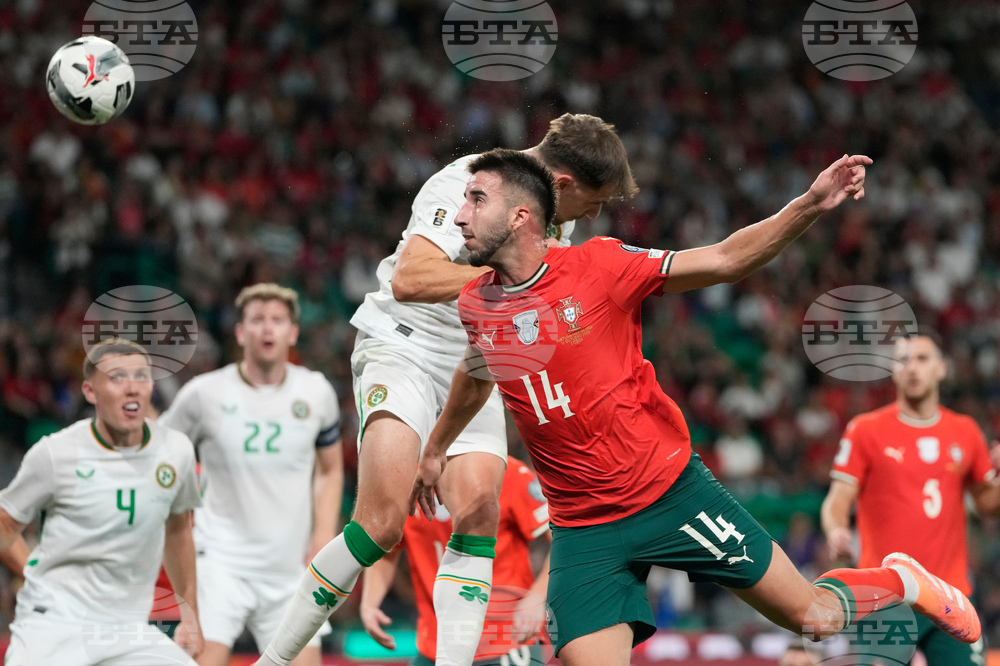 Goncalo Inacio of Portugal, front, heads a ball next to Jayson Molumby of Ireland during a World Cup 2026 group F qualifying soccer match between Portugal and Ireland in Lisbon, Saturday, Oct. 11, 2025. (AP Photo/Armando Franca)