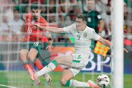Seamus Coleman of Ireland, front, controls a ball chased by Bernardo Silva of Portugal during a World Cup 2026 group F qualifying soccer match between Portugal and Ireland in Lisbon, Saturday, Oct. 11, 2025. (AP Photo/Armando Franca)