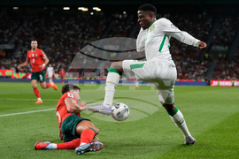 Nuno Mendes of Portugal, front, is tackled by Festy Ebosele of Ireland during a World Cup 2026 group F qualifying soccer match between Portugal and Ireland in Lisbon, Saturday, Oct. 11, 2025. (AP Photo/Armando Franca)