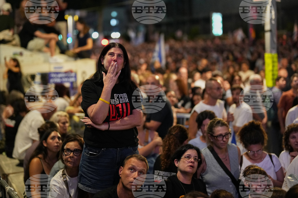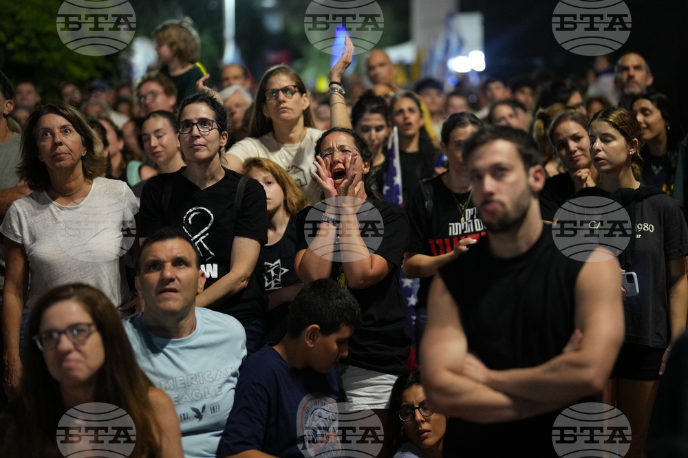 People react during a rally in support of hostages kidnapped by Hamas, at a plaza known as hostages square, in Tel Aviv, Israel, Saturday, Oct. 11, 2025, ahead of the expected release of the hostages held in the Gaza Strip. (AP Photo/Francisco Seco)