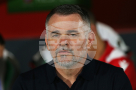 Georgia's coach Willy Sagnol sits on the bench prior to a World Cup 2026 qualifying soccer match between Spain and Georgia at Manuel Martinez Valero stadium in Elche, Spain, Saturday, Oct. 11, 2025. (AP Photo/Alberto Saiz)
