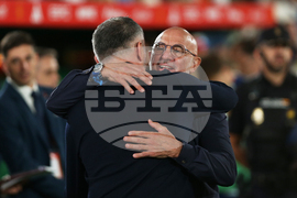 Spain's coach Luis De La fuente, right, greets Georgia's coach Willy Sagnol prior to a World Cup 2026 qualifying soccer match between Spain and Georgia at Manuel Martinez Valero stadium in Elche, Spain, Saturday, Oct. 11, 2025. (AP Photo/Alberto Saiz)