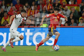 Spain's Mikel Merino, left, challenges Georgia's Zuriko Davitashvili during a World Cup 2026 Group E qualifying soccer match between Spain and Georgia at Manuel Martinez Valero stadium in Elche, Spain, Saturday, Oct. 11, 2025. (AP Photo/Alberto Saiz)