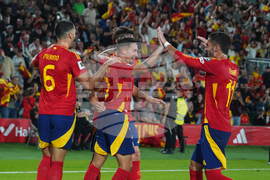 Spain's Yeremy Pino, center, is congratulated after scoring his side's opening goal during a World Cup 2026 qualifying soccer match between Spain and Georgia at Manuel Martinez Valero stadium in Elche, Spain, Saturday, Oct. 11, 2025. (AP Photo/Alberto Saiz)