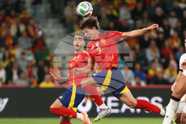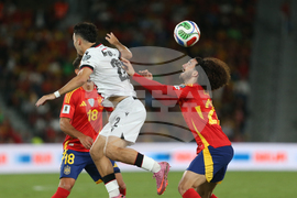 Spain's Robin Le Normand, right, heads the ball on goal during a World Cup 2026 qualifying soccer match between Spain and Georgia at Manuel Martinez Valero stadium in Elche, Spain, Saturday, Oct. 11, 2025. (AP Photo/Alberto Saiz)