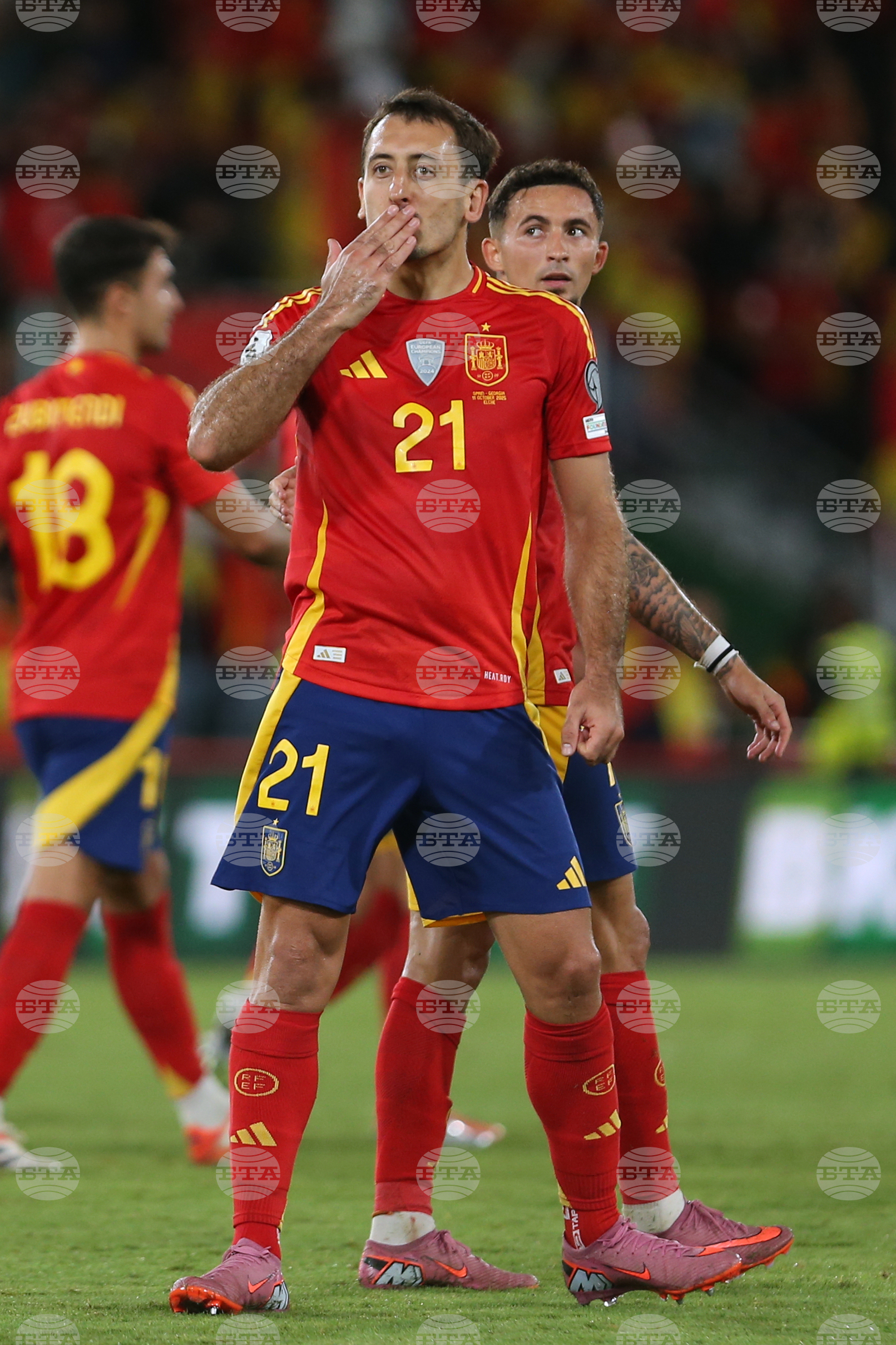 Spain's Mikel Merino gestures during a World Cup 2026 qualifying soccer match between Spain and Georgia at Manuel Martinez Valero stadium in Elche, Spain, Saturday, Oct. 11, 2025. (AP Photo/Alberto Saiz)