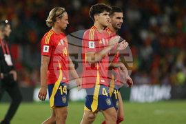 Spain's Robin Le Normand (3) and teammates leave the pitch after a World Cup 2026 Group E qualifying soccer match between Spain and Georgia at Manuel Martinez Valero stadium in Elche, Spain, Saturday, Oct. 11, 2025. (AP Photo/Alberto Saiz)