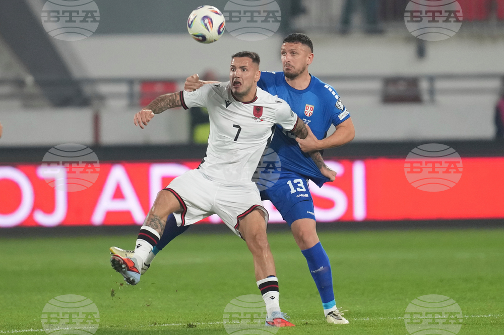 Albania's Myrto Uzuni, left, jumps for a header with Serbia's Andrija Zivkovic during the World Cup Group K qualifying soccer match between Serbia and Albania, at the Dubocica Stadium in Leskovac, Serbia, Saturday, Oct. 11, 2025. (AP Photo/Darko Vojinovic)