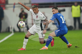 Albania's Rey Manaj jumps for a header during the World Cup Group K qualifying soccer match between Serbia and Albania, at the Dubocica Stadium in Leskovac, Serbia, Saturday, Oct. 11, 2025. (AP Photo/Darko Vojinovic)