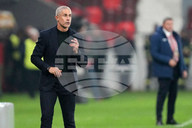Albania coach Sylvinho yells at the end of the World Cup Group K qualifying soccer match between Serbia and Albania, at the Dubocica Stadium in Leskovac, Serbia, Saturday, Oct. 11, 2025. (AP Photo/Darko Vojinovic)