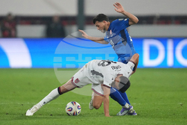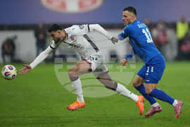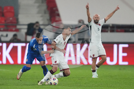 Serbia's Filip Kostic, left, is challenged by Albania's Nedim Bajrami during the World Cup Group K qualifying soccer match between Serbia and Albania, at the Dubocica Stadium in Leskovac, Serbia, Saturday, Oct. 11, 2025. (AP Photo/Darko Vojinovic)