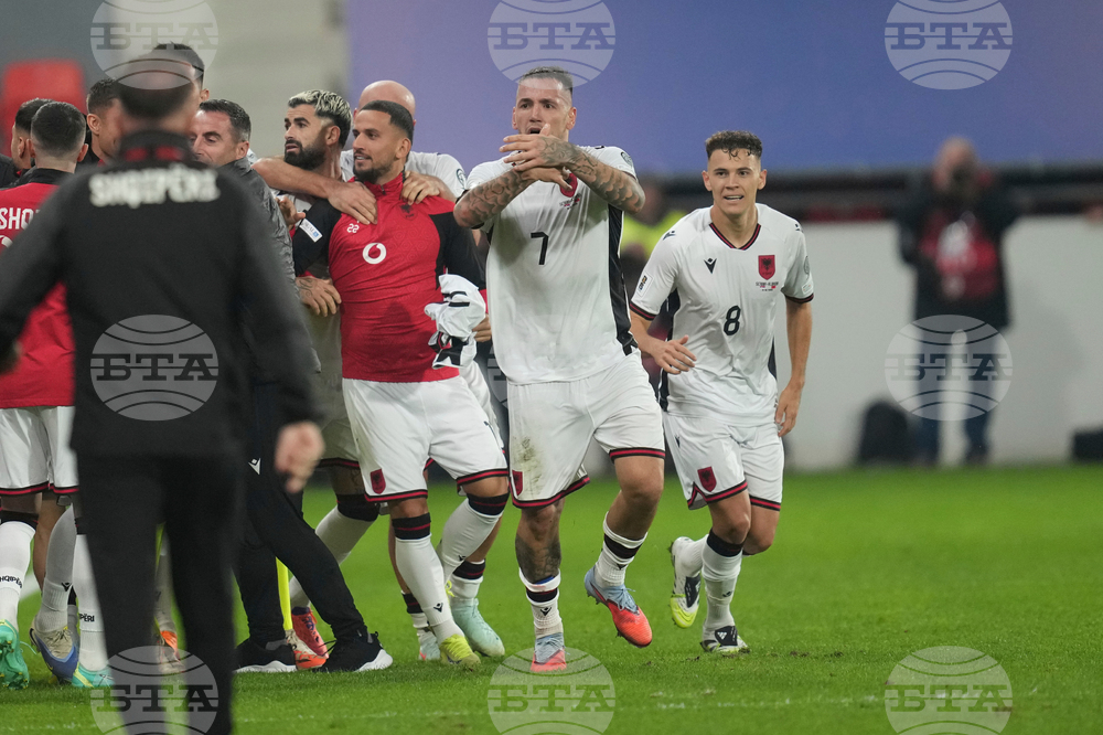Albania's Rey Manaj, center, celebrates after scoring his side's opening goal during the World Cup Group K qualifying soccer match between Serbia and Albania, at the Dubocica Stadium in Leskovac, Serbia, Saturday, Oct. 11, 2025. (AP Photo/Darko Vojinovic)