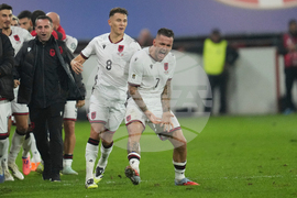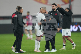 Albania's Ardian Ismajli celebrates after the World Cup Group K qualifying soccer match between Serbia and Albania, at the Dubocica Stadium in Leskovac, Serbia, Saturday, Oct. 11, 2025. (AP Photo/Darko Vojinovic)
