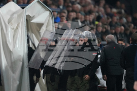 Serbian gendarmerie secure players' tunnel during the World Cup Group K qualifying soccer match between Serbia and Albania, at the Dubocica Stadium in Leskovac, Serbia, Saturday, Oct. 11, 2025. (AP Photo/Darko Vojinovic)