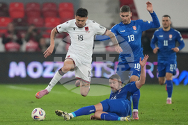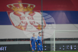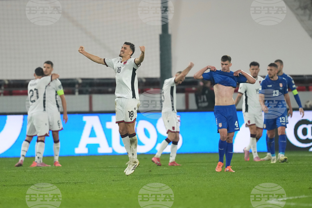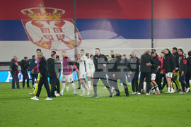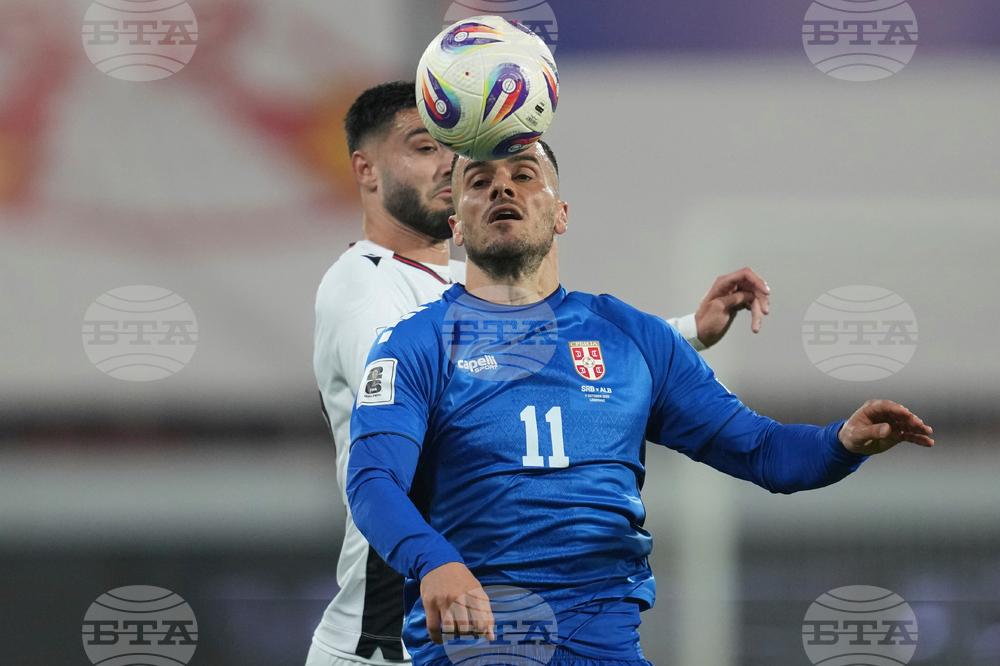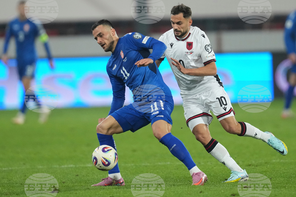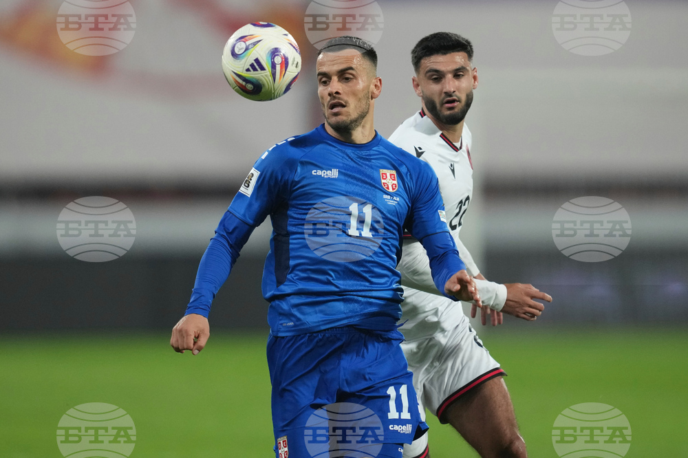 during the World Cup Group K qualifying soccer match between Serbia and Albania, at the Dubocica Stadium in Leskovac, Serbia, Saturday, Oct. 11, 2025. (AP Photo/Darko Vojinovic)