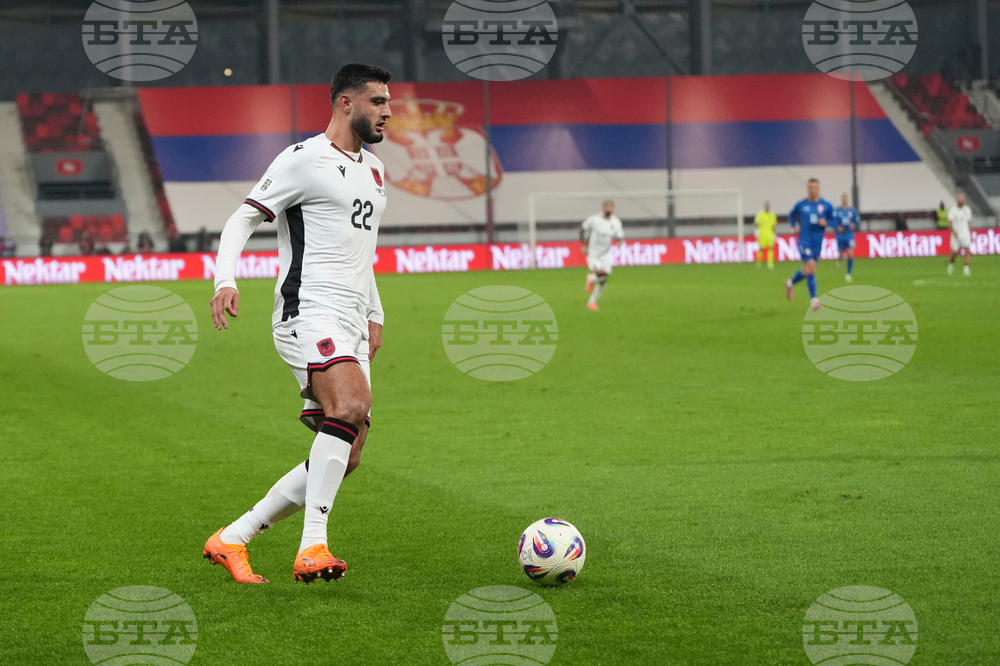 Albania's Myrto Uzuni, left, is challenged by Serbia's Andrija Zivkovic during the World Cup Group K qualifying soccer match between Serbia and Albania, at the Dubocica Stadium in Leskovac, Serbia, Saturday, Oct. 11, 2025. (AP Photo/Darko Vojinovic)