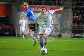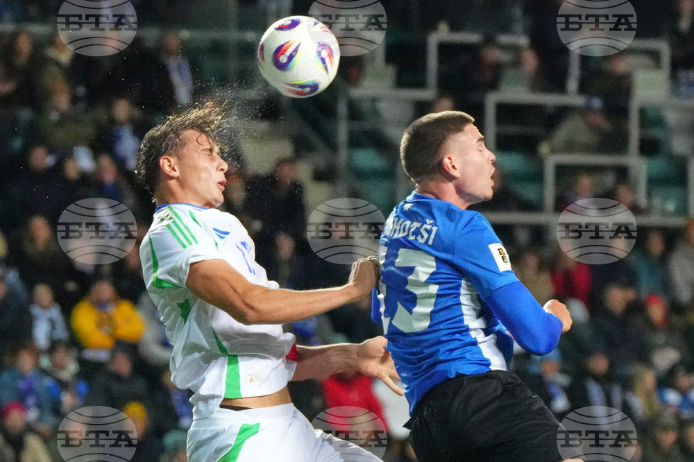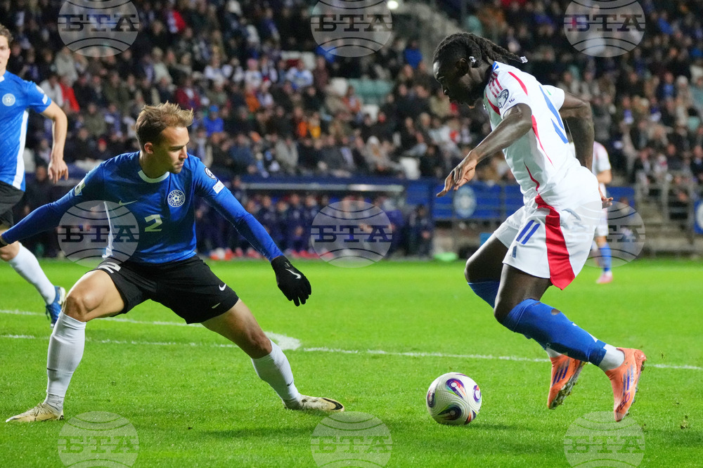 Italy's Francesco Pio Esposito, left, and Estonia's Maksim Paskotsi battle for the ball during a World Cup 2026 group I qualifying soccer match between Estonia and Italy in Tallinn, Estonia, Saturday, Oct. 11, 2025. (AP Photo/Sergei Grits)