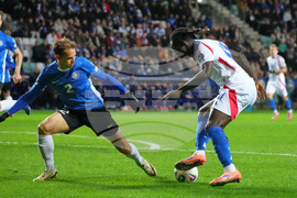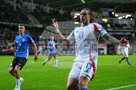 Italy's Francesco Pio Esposito gets away from Estonia's Marten Kuusk during a World Cup 2026 group I qualifying soccer match between Estonia and Italy in Tallinn, Estonia, Saturday, Oct. 11, 2025. (AP Photo/Sergei Grits)