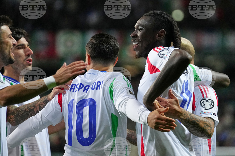 Italy players celebrate after Italy's Francesco Pio Esposito scored his side's third goal during a World Cup 2026 group I qualifying soccer match between Estonia and Italy in Tallinn, Estonia, Saturday, Oct. 11, 2025. (AP Photo/Sergei Grits)