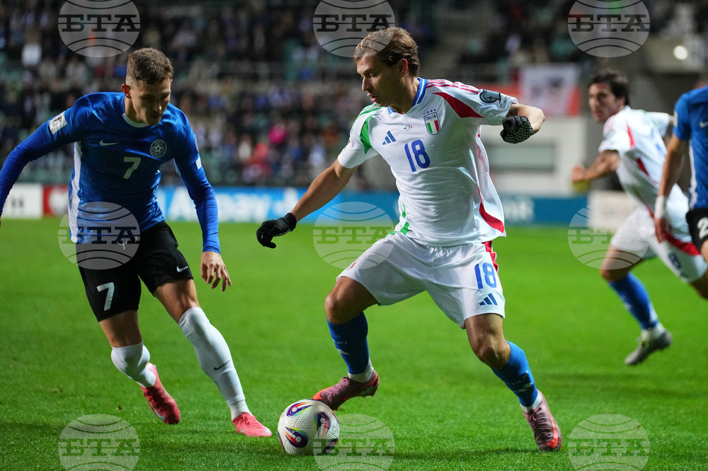 Italy's Nicolo Barella, right, is challenged by Estonia's Robi Saarma during a World Cup 2026 group I qualifying soccer match between Estonia and Italy in Tallinn, Estonia, Saturday, Oct. 11, 2025. (AP Photo/Sergei Grits)