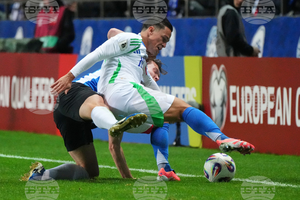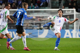 Italy's Nicolo Barella heads the ball during a World Cup 2026 group I qualifying soccer match between Estonia and Italy in Tallinn, Estonia, Saturday, Oct. 11, 2025. (AP Photo/Sergei Grits)