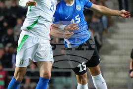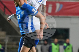 Estonia's Alex Matthias Tamm, left, heads the ball ahead of Italy's Giovanni Di Lorenzo during a World Cup 2026 group I qualifying soccer match between Estonia and Italy in Tallinn, Estonia, Saturday, Oct. 11, 2025. (AP Photo/Sergei Grits)