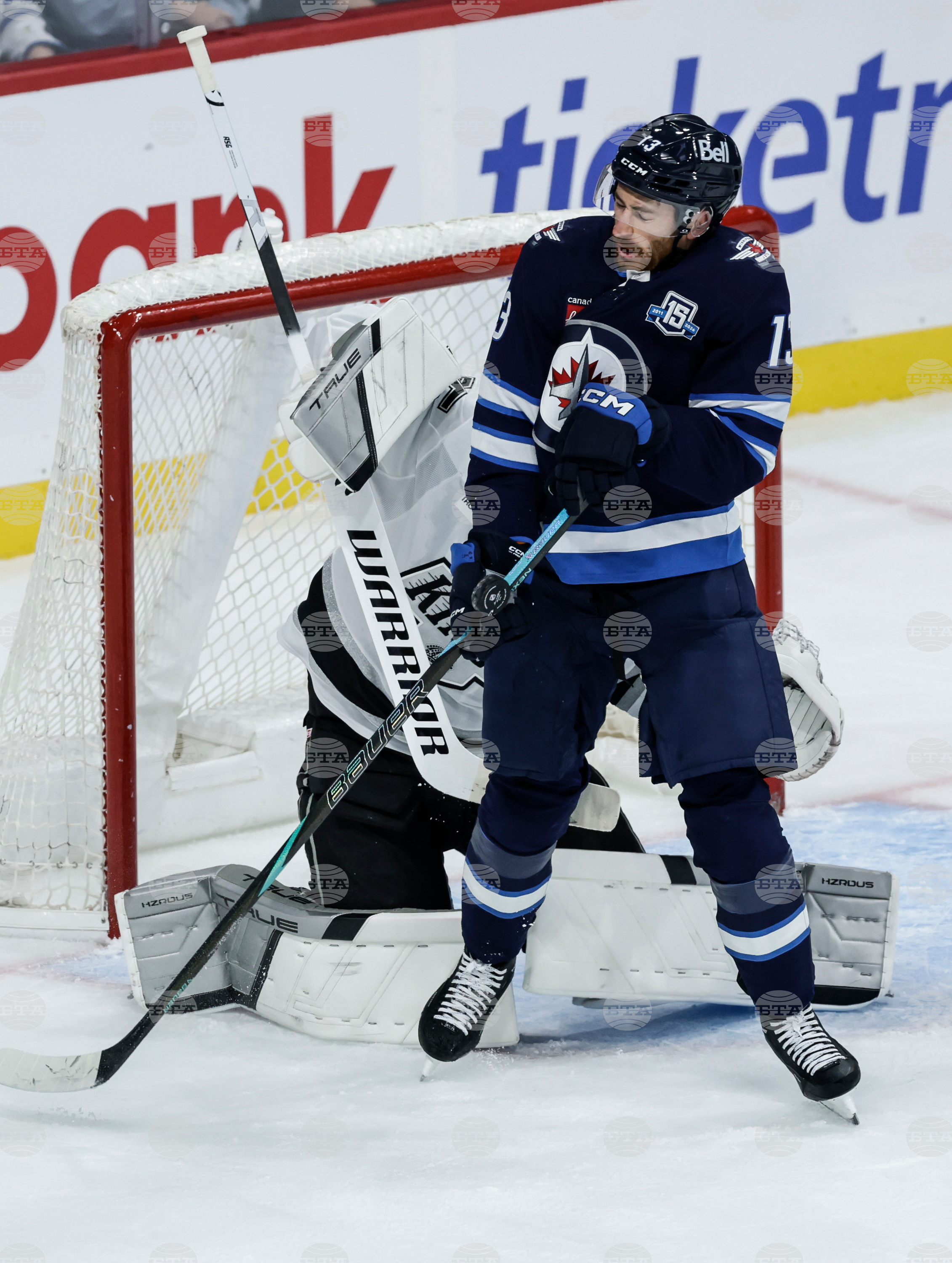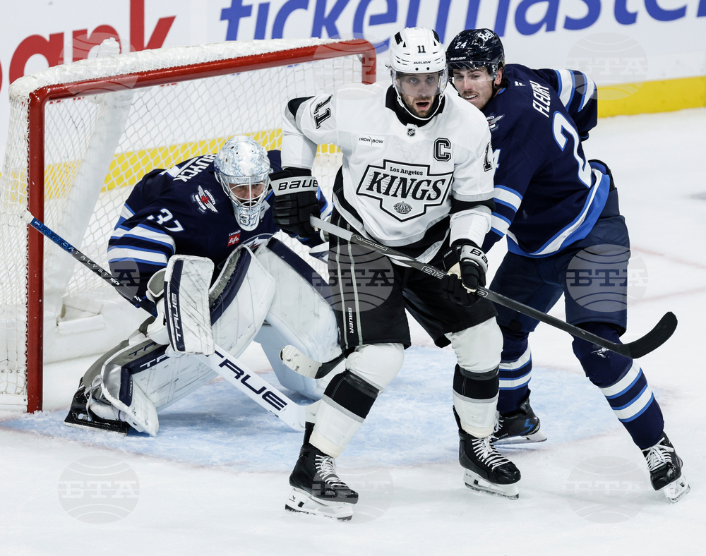 Winnipeg Jets' Kyle Connor (81) and Morgan Barron (36) look on as Mark Scheifele (55) shot gets past Los Angeles Kings goaltender Darcy Kuemper (35) during the second period of an NHL game in Winnipeg, Manitoba, Saturday, Oct. 11, 2025. (John Woods/The Canadian Press via AP)