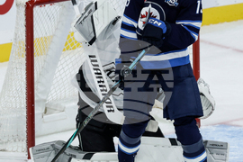 Winnipeg Jets goaltender Connor Hellebuyck (37) looks for the puck as Hadyn Fleury (24) defends against Los Angeles Kings' Anze Kopitar (11) during the second period of an NHL game in Winnipeg, Manitoba, Saturday, Oct. 11, 2025. (John Woods/The Canadian Press via AP)