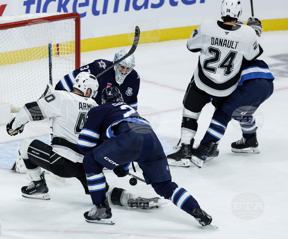 Winnipeg Jets celebrate Alex Iafallo's (9) goal against Los Angeles Kings goaltender Darcy Kuemper (35) during the first period of an NHL game in Winnipeg, Manitoba, Saturday, Oct. 11, 2025. (John Woods/The Canadian Press via AP)