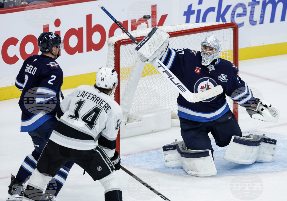 Winnipeg Jets goaltender Connor Hellebuyck (37) reaches out for the puck as Dylan DeMelo (2) defends against Los Angeles Kings' Alex Laferriere (14) during the second period of an NHL game in Winnipeg, Manitoba, Saturday, Oct. 11, 2025. (John Woods/The Canadian Press via AP)