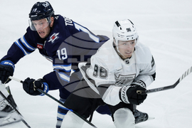 Winnipeg Jets' Jonathan Toews (19) and Los Angeles Kings' Andrei Kuzmenko (96) battle for position during the third period of an NHL game in Winnipeg, Manitoba, Saturday, Oct. 11, 2025. (John Woods/The Canadian Press via AP)