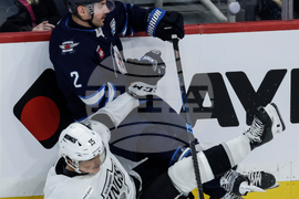 Winnipeg Jets' Dylan DeMelo (2) defends against Los Angeles Kings' Joel Armia (40) during the second period of an NHL game in Winnipeg, Manitoba, Saturday, Oct. 11, 2025. (John Woods/The Canadian Press via AP)