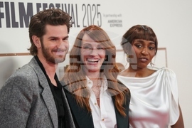 Andrew Garfield, left, Julia Roberts and Ayo Edebiri pose for photographers upon arrival at the premiere of the film "After The Hunt" during the London film festival, in London, Saturday, Oct. 11, 2025. (Photo by Alberto Pezzali/Invision/AP)