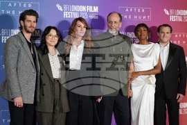 Andrew Garfield, from left Thaddea Graham, Julia Roberts, Luca Guadagnino, Ayo Edebiri and Michael Stuhlbarg pose for photographers upon arrival at the premiere of the film "After The Hunt" during the London film festival, in London, Saturday, Oct. 11, 2025. (Photo by Alberto Pezzali/Invision/AP)