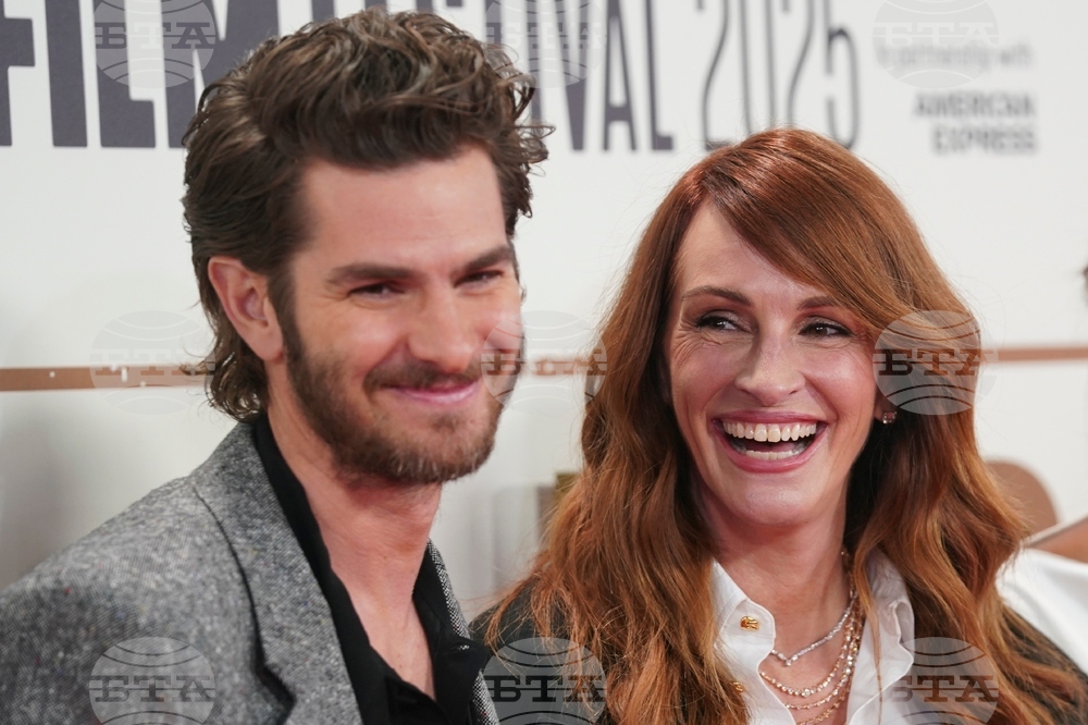 Andrew Garfield, left, and Julia Roberts react as they pose for photographers upon arrival at the premiere of the film "After The Hunt" during the London film festival, in London, Saturday, Oct. 11, 2025. (Photo by Alberto Pezzali/Invision/AP)