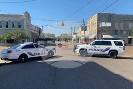 Police vehicles are parked after a deadly shooting Friday night in downtown Leland, Miss.,on Saturday, Oct. 11, 2025. (AP Photo/Katie Adkins)