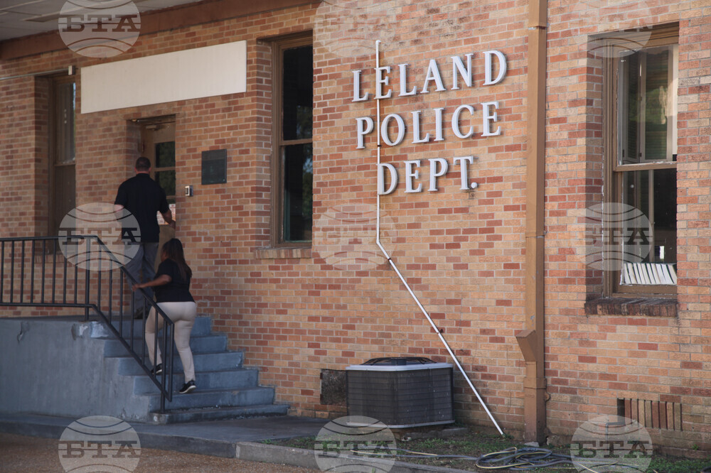 Members of the Leland Police Department enter the police station in Leland, Miss., Saturday, Oct. 11, 2025, after a homecoming shooting. (AP Photo/Katie Adkins)