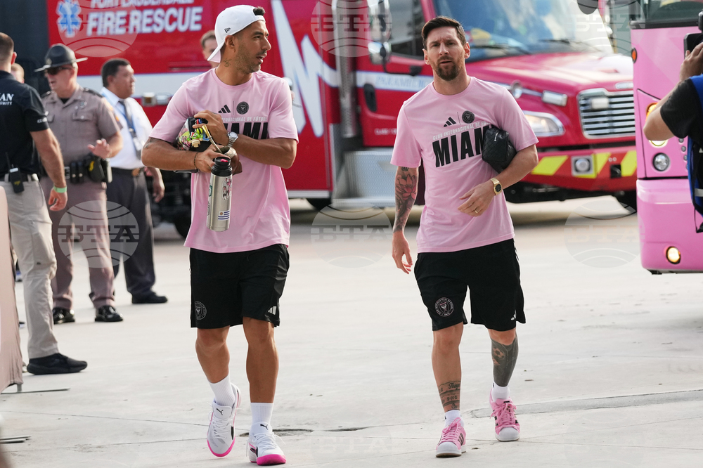 Inter Miami's Luis Suárez, left, and Lionel Messi, right, arrive for an MLS soccer match against Atlanta United, Saturday, Oct. 11, 2025, in Fort Lauderdale, Fla. (AP Photo/Lynne Sladky)
