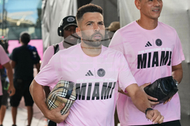 Inter Miami's Jordi Alba arrives for an MLS soccer match against Atlanta United, Saturday, Oct. 11, 2025, in Fort Lauderdale, Fla. (AP Photo/Lynne Sladky)