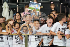 Fans cheer while Inter Miami's Lionel Messi warms up before an MLS soccer match against Atlanta United, Saturday, Oct. 11, 2025, in Fort Lauderdale, Fla. (AP Photo/Lynne Sladky)