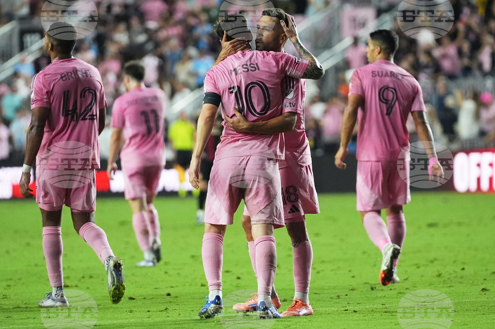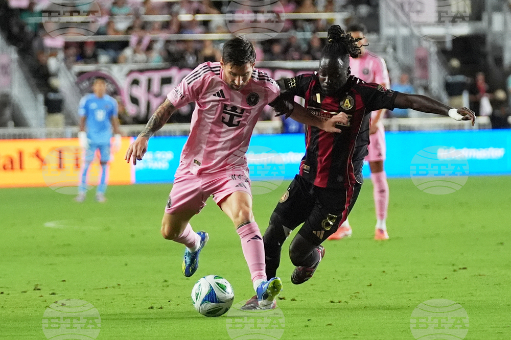 Inter Miami forward Lionel Messi, left, runs with the ball as Atlanta United midfielder Tristan Muyumba, right, defends during the first half of an MLS soccer match, Saturday, Oct. 11, 2025, in Fort Lauderdale, Fla. (AP Photo/Lynne Sladky)
