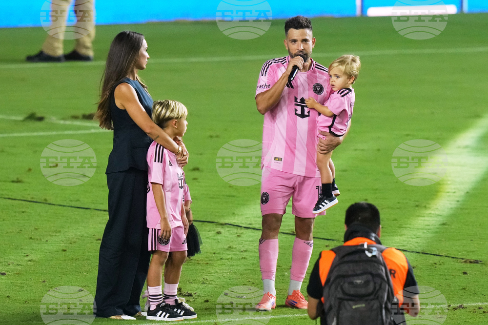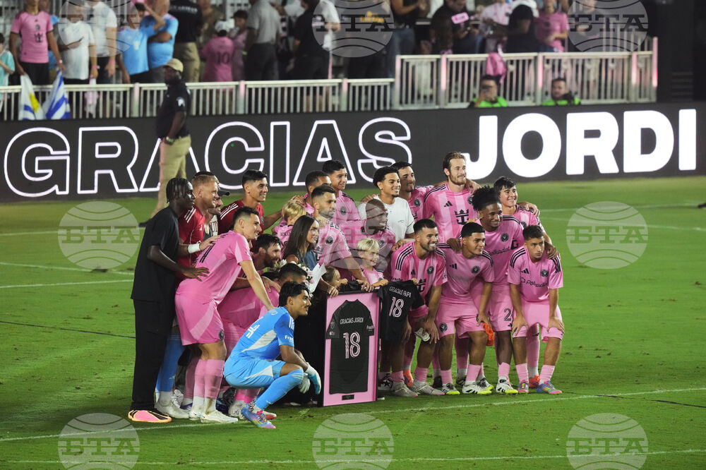 Inter Miami defender Jordi Alba, center, left, who has announced his retirement, stands with his family and teammates for a tribute to his career after an MLS soccer match against Atlanta United, Saturday, Oct. 11, 2025, in Fort Lauderdale, Fla. (AP Photo/Lynne Sladky)