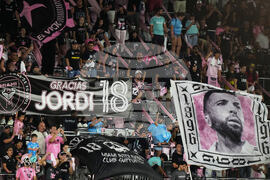 Fans waves flags as a tribute to Inter Miami defender Jordi Alba who has announced his retirement, after an MLS soccer match against Atlanta United, Saturday, Oct. 11, 2025, in Fort Lauderdale, Fla. (AP Photo/Lynne Sladky)