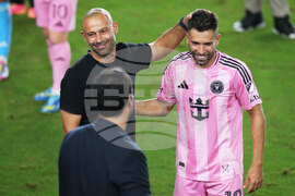Inter Miami head coach Javier Mascherano, left, stands with defender Jordi Alba, right, who has announced his retirement, during a tribute to his career after an MLS soccer match against Atlanta United, Saturday, Oct. 11, 2025, in Fort Lauderdale, Fla. (AP Photo/Lynne Sladky)