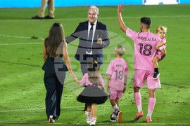 Inter Miami defender Jordi Alba (18) who has announced his retirement, walks on the field with his family and managing owner Jorge May, center, during a tribute to his career after an MLS soccer match against Atlanta United, Saturday, Oct. 11, 2025, in Fort Lauderdale, Fla. (AP Photo/Lynne Sladky)