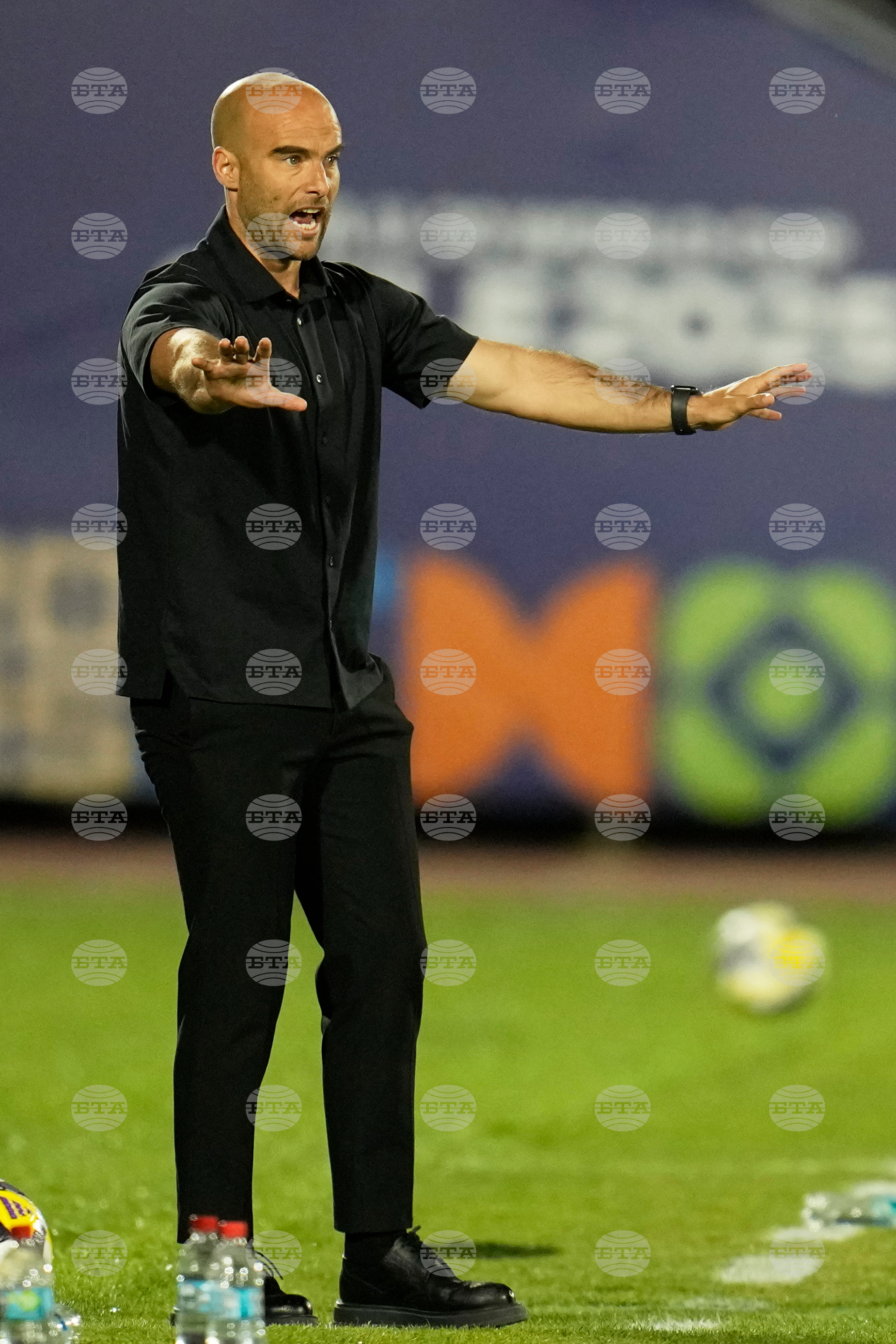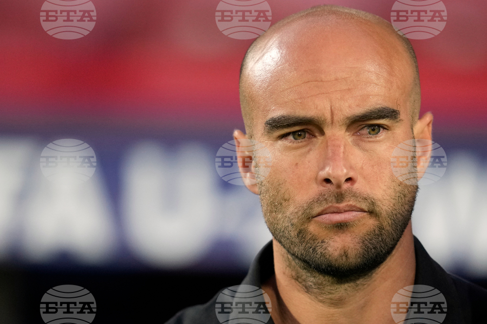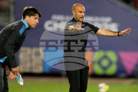 Argentina's coach Diego Pacente stands on the bench prior to the start of a FIFA U-20 World Cup quater-final soccer match against Mexico at National Stadium in Santiago, Chile, Saturday, Oct. 11, 2025. (AP Photo/Matias Delacroix)
